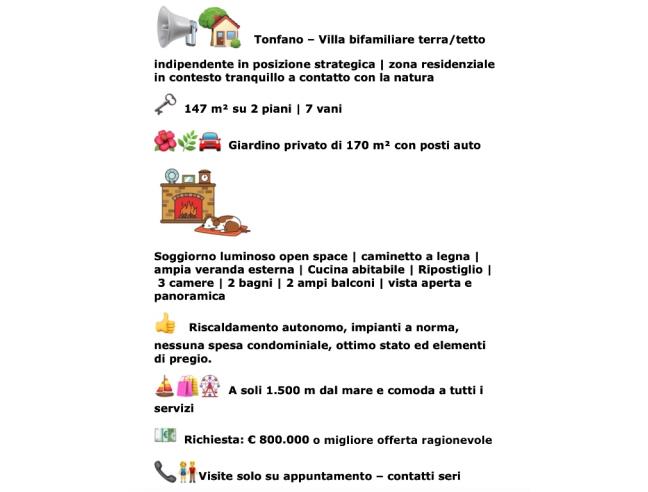 Villa bifamiliare su due piani fuori terra, versante mare, superficie totale 147mq, sette vani in cui gli spazi, luminosi e comodi da vivere, sono molto ben organizzati e funzionali - più 170 mq di giardino privato disposto sui tre lati con cancello automatico, passo carrabile e posti auto interni; sul retro: area coperta attualmente adibita a sgombero/lavanderia; piccola porzione a terrapieno ideale per piante aromatiche e piccoli ortaggi.